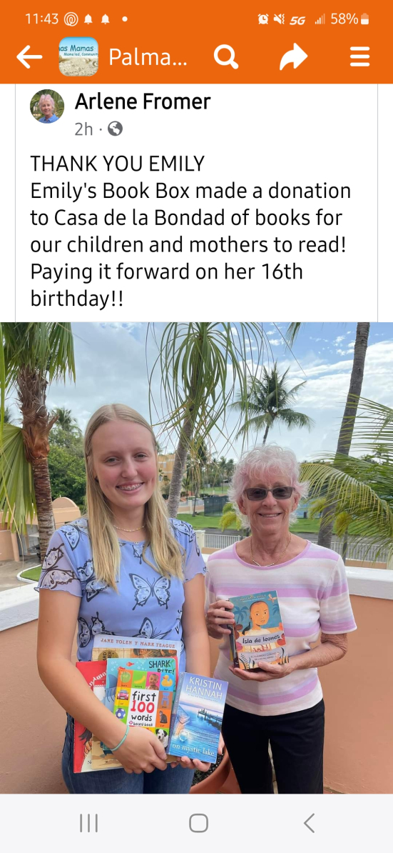 Emily's Book Boxes: Making sure that other children and families have access to books is so important to me. I grew up in a household where getting tucked into bed with a book was normal. I have such great memories of reading books while snuggling with my mom. I would love for all children in Puerto Rico to have that same experience. We have had the pleasure of donating children's books to Casa De la Bondad, Albergue San Miguel Del Coqui, Casa Ronald McDonald, and others. I was able to purchase and donate books by raising money through a bake sale. To learn more about my project visit Emilysbookboxes.com